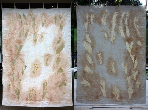 Jedno z 4 dwustronnych płócien tworzących cykl Journey I-IV. Organiczne pigmenty i wosk na płótnie bawełnianym, elementy techniki batiku.