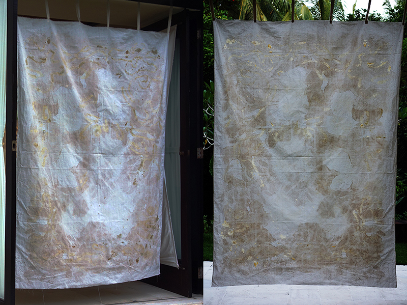 Jedno z 4 dwustronnych płócien tworzących cykl Journey I-IV. Organiczne pigmenty i wosk na płótnie bawełnianym, elementy techniki batiku.