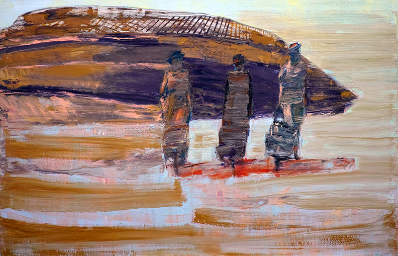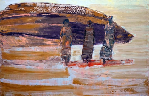 Budowa Pomnika Piłsudskiego w Krakowie. Postanowiono, że będzie miał formę kopca, w nawiązaniu do już istniejącego pomnika-kopca Tadeusza Kościuszki i kopców pogańskich zachowanych na obszarze zajmowanym przez miasto Kraków. Budowa miała charakter czynu powszechnego i nawet damy w kapeluszach i w koronkowych rękawiczkach brały symboliczny udział w tym działaniu. Moja babcia z przyjaciółkami także się przyłączyły, co wówczas było raczej typowe, pożądane i oczywiście modne. Mnie ujęło ówczesne prawie „selfie”, jakie sobie szanowne panie z tej okazji wykonały: na placu budowy, z odpowiednimi atrybutami – taczkami wypełnionymi materiałem budowlanym i pomnikiem w budowie w tle, a bohaterki zdjęcia elegancko ubrane – w wyjściowych sukniach, zdobionych kapeluszach i tych koronkowych rękawiczkach. W takim też duchu namalowałam pierwszą wersje obrazu („Budowa Kopca, 1937”). W drugiej wersji, na bazie rozwiązań plastycznych – sposób malowania większości płaszczyzny płótna, najmniej w plamie kopca – pojawiła się aluzja do podróży orientalnych, popularnych w pewnych środowiskach już w XIX wieku. Powszechnie znamy typową dokumentację fotograficzną z takich wypraw przedstawiającą osoby w strojach europejskich, niemal salonowych, na tle piramid, często też i wielbłąda naraz, czyli wygląd postaci jawi się jako kompletnie absurdalny w kontekście miejsca. Brak detalu, swobodny ruch pędzla mają w obrazie oddać wrażenie fatamorgany (efekt typowy dla obszarów pustynnych) i wraz z kolorystyką podkreślać wspomniane odniesienie.