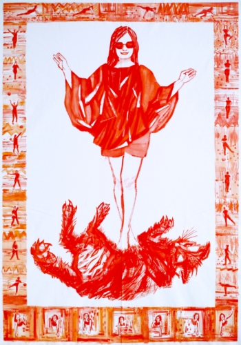 Przedstawiam Małgorzatę z popularnymi domowymi pupilami: kotem lub psem, które w poszczególnych wyobrażeniach nabierają mniej lub bardziej drapieżnego wyglądu. Ekspresja form i sposób malowania są powiązane z interpretacją barw występujących w wyobrażeniach świętej. Otóż przedstawienia świętej Małgorzaty powinny, według tradycji, uwzględniać trzy kolory, które mają wtedy znaczenie symboliczne. Pierwszy to czerwień – symbolizująca męczeństwo, ale też piękno, dobroć, młodość i zaangażowaną wiarę. Drugi to błękit – męczeńska śmierć została nagrodzona wstąpieniem do nieba, życiem wiecznym, a więc to symbol życia pozaziemskiego. Wreszcie zieleń – odnosi się do innych wiernych, szczególnie tych poświęcających się dla wiary, a także do Ducha Świętego. Inspirując się znaczeniem tych trzech kolorów w wizerunku Świętej, zdecydowałam się na monochromatyczne przedstawienia zrealizowane w czerwieni, błękicie i zieleni.