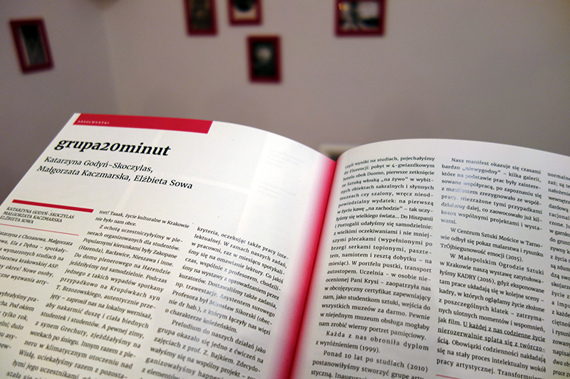 W specjalnym wydaniu Wiadomości ASP (84), powstałym w związku z Jubileuszem 100-lecia kobiet w Akademii, ukazał sie tekst o grupie20minut (Katarzyna Godyń-Skoczylas, Małgorzata Kaczmarska, Elżbieta Sowa) naszego autorstwa. Egzemplarz publikacji stał się elementem wystawy w krakowskim Pałacu Sztuki zorganizowanej w ramach obchodów 200-lecia Akademii Sztuk Pięknych w Krakowie. Wystawa nosi tytuł "Dotyk Wolności" i upamiętnia także stulecie odzyskania przez Polskę niepodległości.